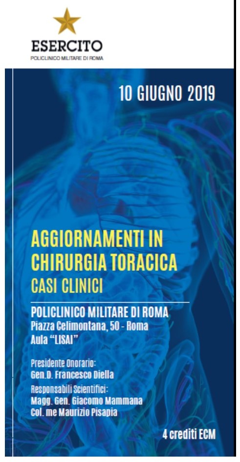 AGGIORNAMENTI IN CHIRURGIA TORACICA - Casi clinici Roma, 10 giugno 2019 - Policlinico Militare "Celio" 4 CREDITI ECM. Il corso è a pagamento ed a numero chiuso.