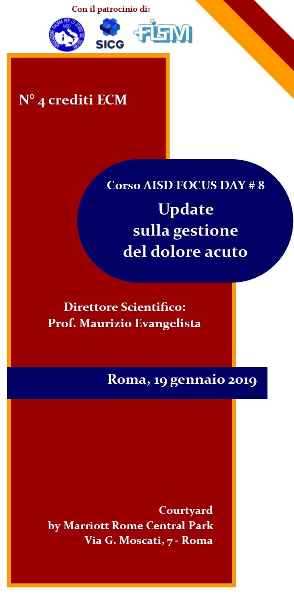 Corso AISD FOCUS DAY # 8 "Update sulla gestione del dolore acuto" Roma, 19 gennaio 2019 - Courtyard by Marriott Rome Central Park 4 CREDITI ECM. Il corso è gratuito ed a numero chiuso