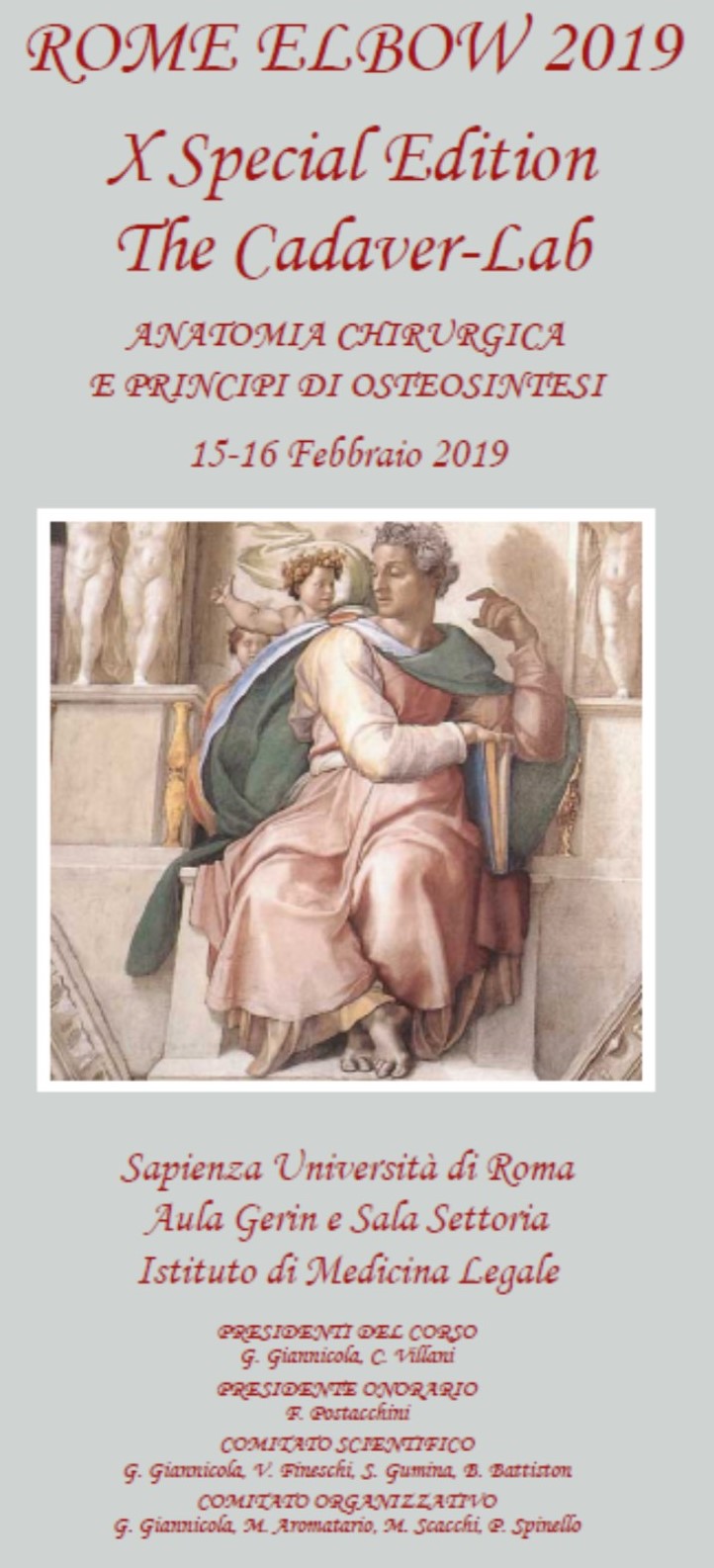 Rome Elbow 2019 X SPECIAL EDITION - THE CADAVER-LAB "Anatomia chirurgica e principi di osteosintesi" Roma, 15-16 febbraio 2019 - Aula Gerin e Sala Settoria, Istituto di Medicina Legale, Policlinico Umberto I Venerdì 15 febbraio: n. 8
