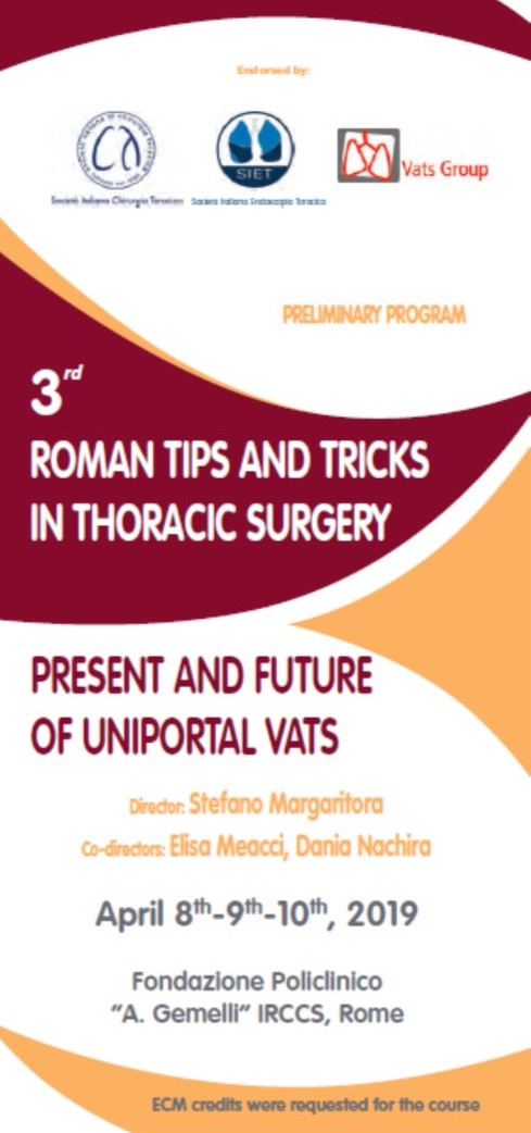 3rd ROMAN TIPS AND TRICKS IN THORACIC SURGERY Present and future of uniportal VATS Rome, April 8-10 2019