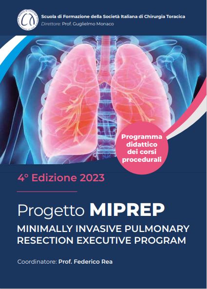 Progetto MIPREP IV edizione MINIMALLY INVASIVE PULMONARY RESECTION EXECUTIVE PROGRAM PADOVA 9 | 10 maggio 2023 ROMA 7 | 8 giugno 2023 ANCONA 20 | 21 Settembre & 18 | 19 Ottobre 2023PADOVA CADAVER LAB 15 Dicembre 2023 Scuola di Formazione della Società Italiana di Chirurgia Toracica Direttore: Prof. Guglielmo Monaco Coordinatore: Prof. Federico Rea